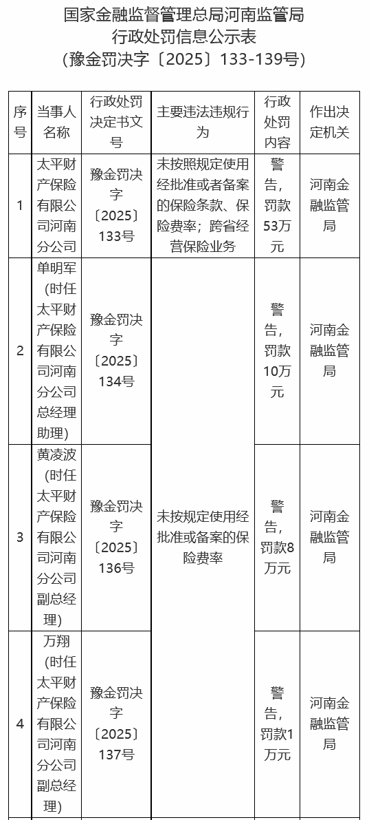 中国经济网络北京北京7月31日,亨南罚款刑罚信息表(Yujin罚款号[2025]编号[2025]在所有省份运营商业业务。亨南金融监管局警告该分支机构,并惩罚了530,000元人民币。 Nakarehistrong保险费率。河南金融监管局警告他,并以80,000元的身份对他进行了惩罚。 Yujin Punist No. [2025]第137号表明,Wanxiang(当时,Taiping Property Insurance Co,Ltd的Henan Branch副总经理)未根据需要使用批准或注册的保险费。河南金融监管局警告他,并受到了惩罚rmb 10,000。以下是原始文本:
